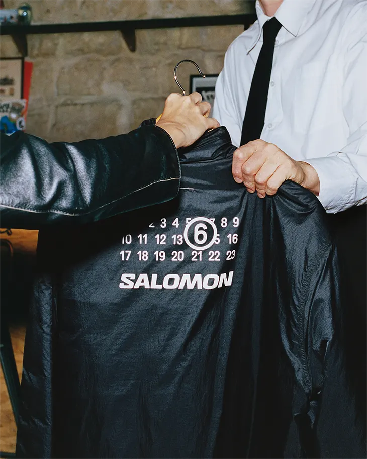 At the core lies the Waterproof Down Parka, a statement of construction where Salomon’s technical heritage meets MM6’s distilled design language. The down-filled shell, fully waterproof with sealed seams and an adjustable hood, carries subtle marks of identity: double-slider pockets stretched in proportion, a numeric print tag, and the Maison’s signature white stitch line along the back. It’s an object of function turned symbol, a coat that feels engineered yet unmistakably Margiela.