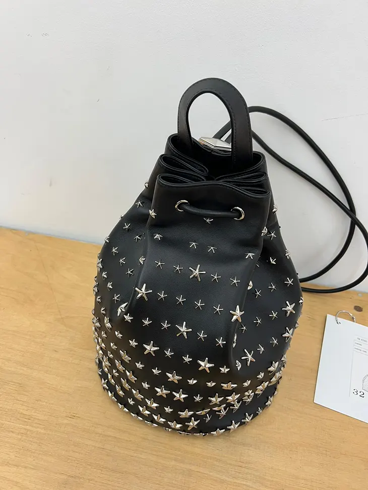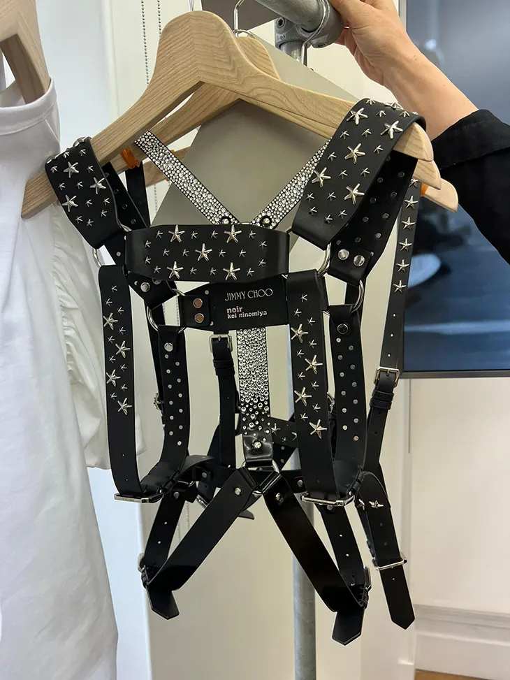 The dialogue continues through accessories. A black leather bucket bag covered in silver star studs connects with matching shoes, translating the same rhythm of precision and excess. The motif repeats in a harness structure built from interlaced leather straps, also studded with stars and crystals.
