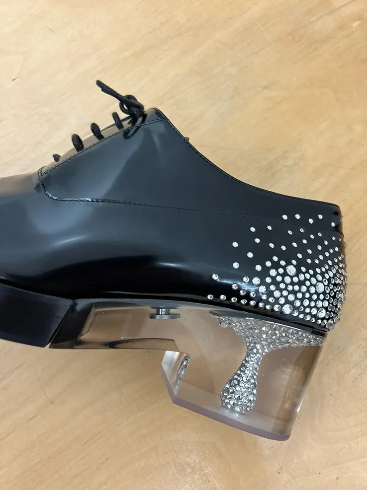 The collection redefines classic footwear through material experiment and balance. Black patent leather forms the base of shoes with sharp masculine profiles, while transparent heels and crystal detailing introduce an unexpected lightness. Each surface feels precise, with polished lace-ups covered in rhinestones that fade into clear cut-out heels.