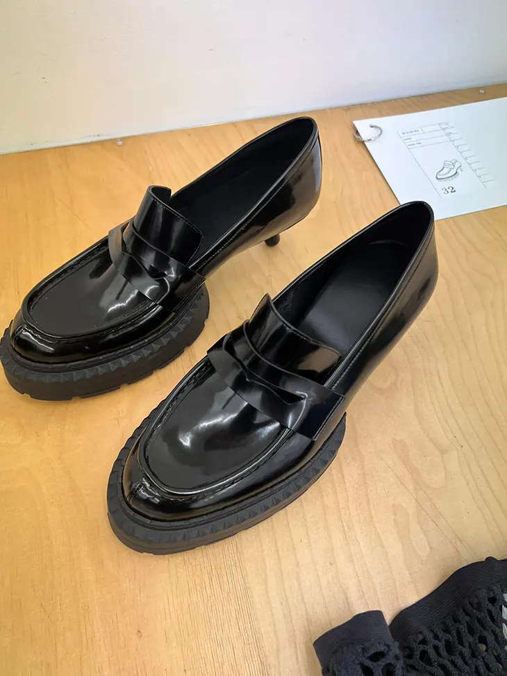 Another design plays with proportion, pairing a thick rubber sole with a delicate stiletto insert. The result challenges conventional silhouettes, turning utility into an element of desire.