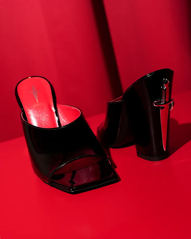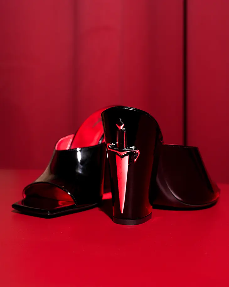 The collection relies on the strength of materials. Calfskin, patent leather, and eel create a tactile dialogue, their surfaces cut, stitched, and shaped into sharp forms. Each material adds a specific weight to the story, calfskin delivers structure, patent leather reflects nocturnal shimmer, and eel pushes the exotic character of the shoes forward.