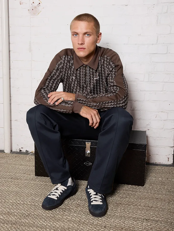 The apparel completes the collection with a nod to early 2000s golf culture, a recurring reference for JJJJound’s approach to sportswear. A jacquard long-sleeve polo features a repeating motif, paired with matching T7 track pants accented by a bold side stripe. The combination recalls the quiet sophistication of leisurewear once seen around the clubhouse, where sport met style in its most effortless form.