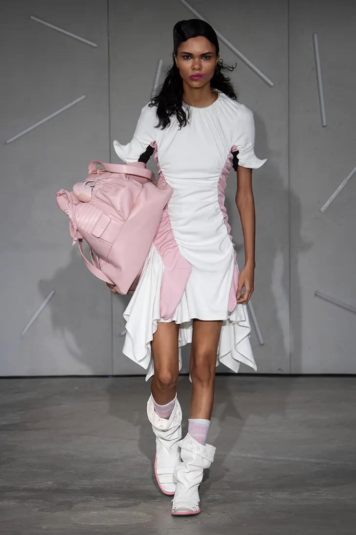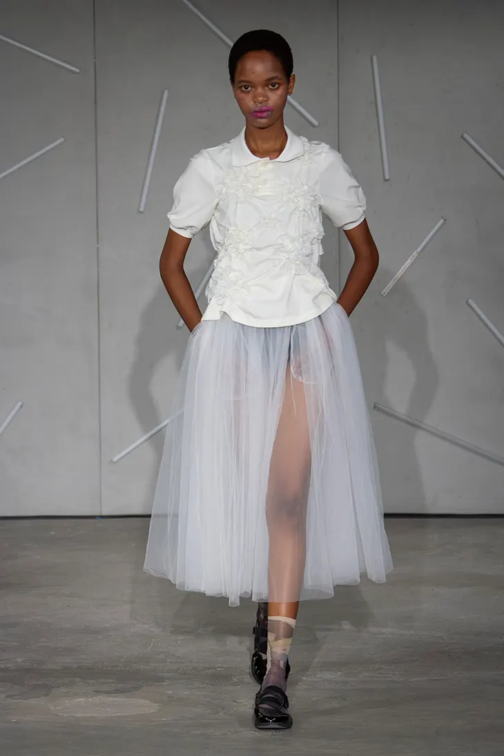 Surface and texture play central roles in this narrative. A tailored bar jacket features black and floral hand embroidery that dissolves into white cotton smocking, producing a visual transition between ideas. Hú revisits her patchwork technique, layering cotton jersey with white and blue tulle to create a textured relief. Floral prints are cut into small squares and appliquéd into pixel-like patterns, while grey organza with pink pintucks gives the illusion of delicate bows. Jersey tops mix athletic materials with corset-inspired details, merging comfort with precision.