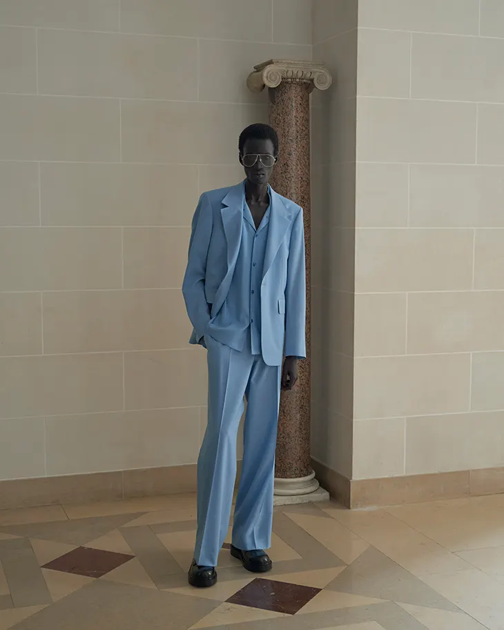 The men’s collection moves with equal attention to balance. Clean, minimalist silhouettes carry the Sandro signature, framed between structure and fluidity. References to the seventies surface again, approached with a focus on modern reinterpretation. The palette sets the tone: latte, cream, cappuccino, beige, and grey create the base, while accents of sky blue, straw yellow, and cognac add depth. Fabrics elevate archetypes, with a trench recast in silk and fluid trousers paired with sharply tailored leather car coats.