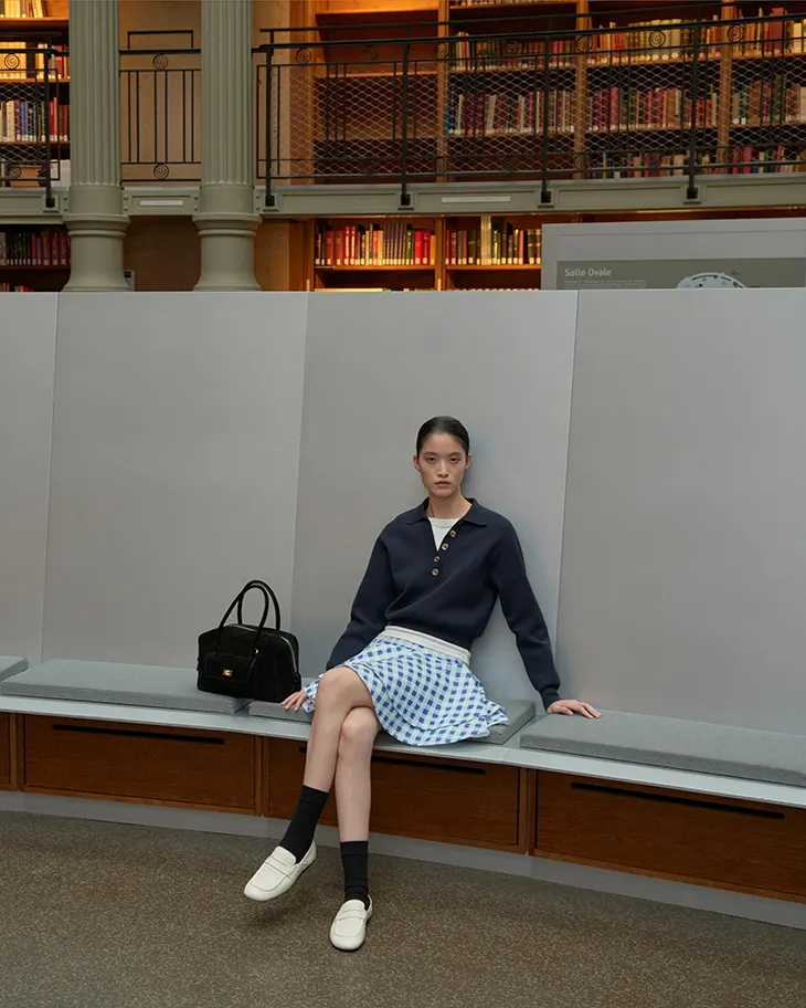Tailoring adjusts proportions with a peplum jacket cinched at the waist and voluminous trousers that establish new balance. The collection also highlights material richness, from embroidered surfaces to textured fabrics crafted with detail. Accessories support the look, with the new Mymi bag carried as a companion for women in motion. The season builds on contrast as a guiding principle, moving between shine and matte surfaces, transparent and opaque fabrics, supple lines and structured forms.