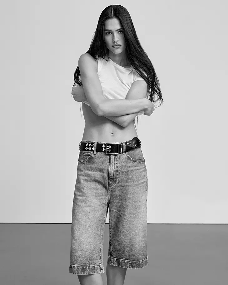 Denim drives the collaboration and sits at the center of the collection. FRAME introduces three silhouettes in authentic washes, each shaped with a specific intention. The Gray, named for the model, focuses on length and line, designed to create an elongated profile. The Detour brings an oversized, low-rise structure that reflects the casual side of Gray’s style. The Jort rounds out the series with a knee-length cut that offers a relaxed option for warm-weather dressing.