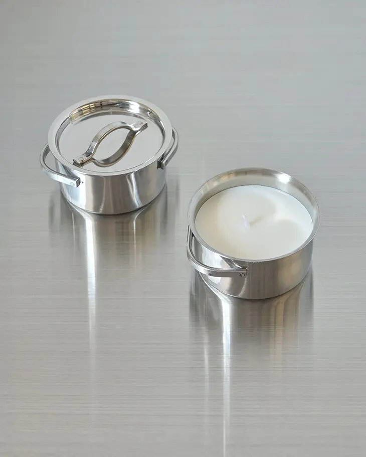 At Basic.Space NY, La Terra di Neena expanded this vocabulary into larger pieces and new material forms. The installation introduced a dining table, stools, and a monolithic sculpture shaped like oversized dented metal canisters, pushing the tin-can reference into monumental scale. Wax candles appeared in the shape of miniature cooking pots, and mirrored dinner plates engraved with La Terra di Neena and Crosby Studios motifs recalled the casual drawings often made on napkins at long family meals.