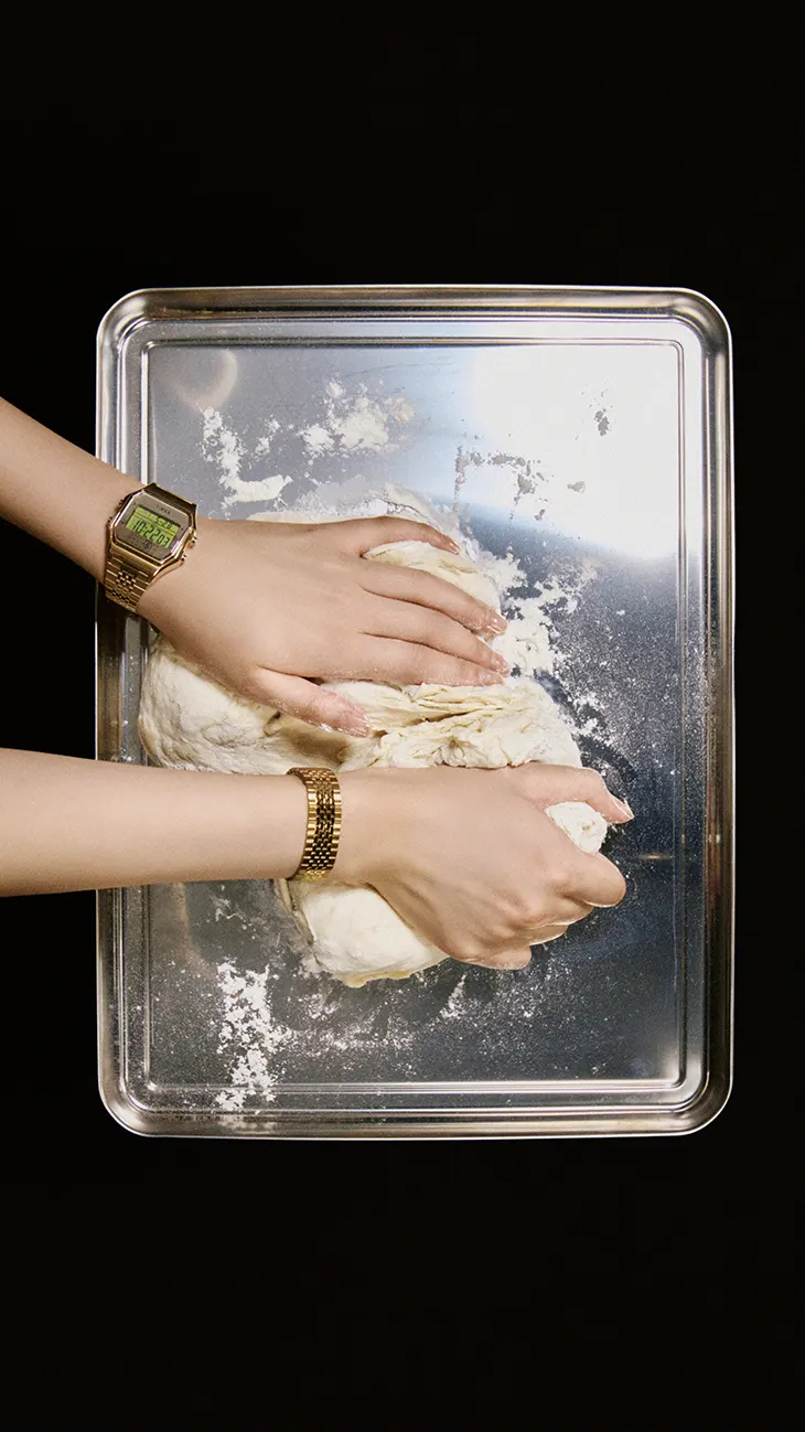Each design connects to MM6’s ongoing study of “Ways to Wear It,” a concept that encourages spontaneity and individual expression. The accompanying campaign presents a sequence of domestic rituals: cooking, preparing for the day, or pausing between tasks. These moments ground the watches in everyday life.