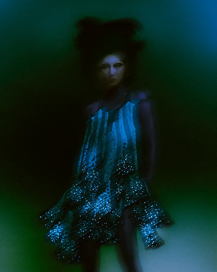 Stylist Christian Ramirez expands the imagery through original illustration-based looks created specifically for this series. His hand-drawn garments act as the clothing, forming silhouettes that develop in post-production rather than on set. Melissa and Christian build a surreal narrative in which styling shifts into an act of invention. Each image forms its own visual space shaped by Christian’s illustrated designs and the precision of Melissa’s photographic framework. The story pushes past the limits of physical wardrobe and uses mixed media to explore new ways of expressing identity within editorial image-making.
