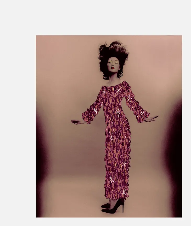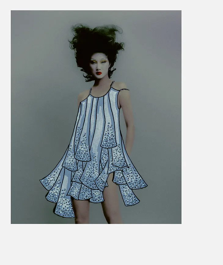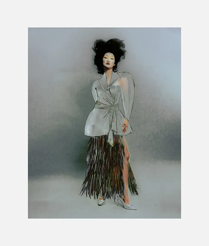 Photographer Melissa Isabel Quiñones captures Moon Choi for the latest DSCENE STYLE STORIES editorial, leading a mixed-media approach that redefines the styling process through illustration, photography, and digital construction. She photographs Choi in a minimal base look, supported by hair from Takayuki Umeda using Oribe and makeup by Michael Chua using Haus Labs, before reshaping each frame through hand-drawn garments integrated in post-production.