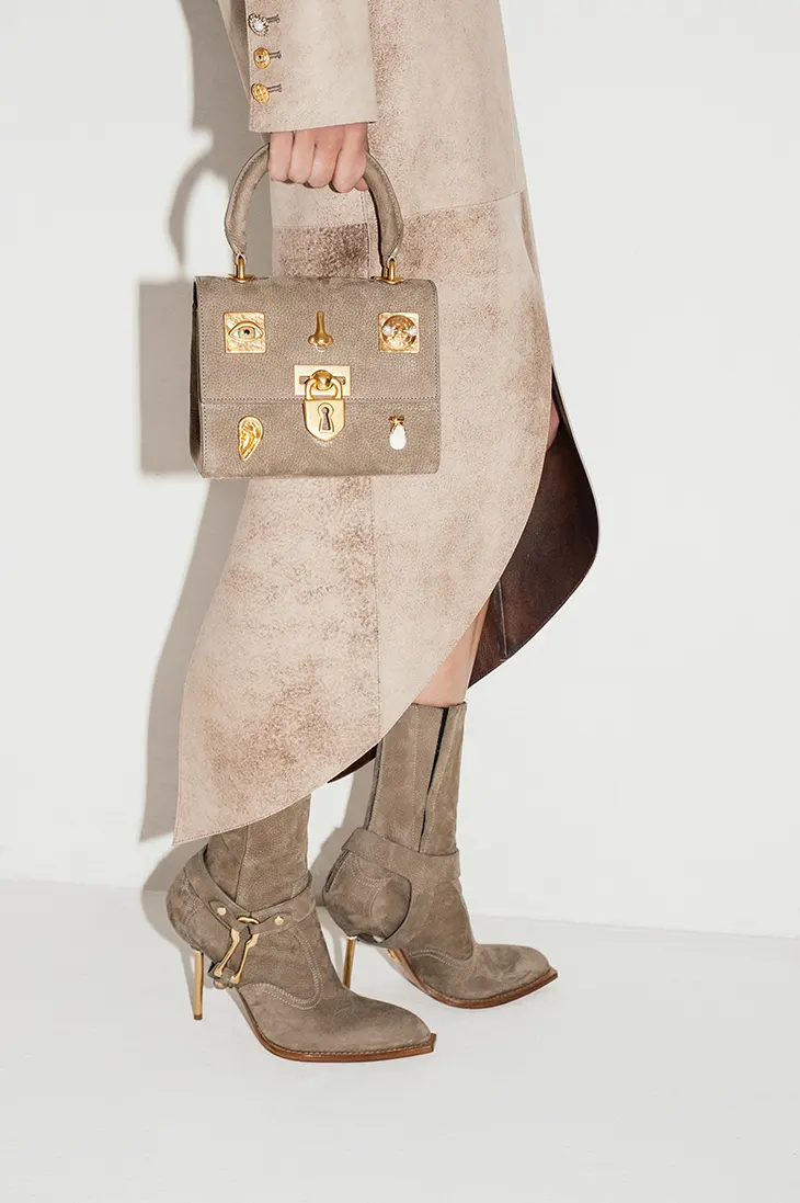 The house also uses tooled leather, a material with a strong link to cowboy tradition. Boots, belts, and bags carry punched and pressed surfaces that reference long-standing methods used to decorate working gear. Roseberry shifts this approach into a luxury context by applying it to controlled volumes and polished silhouettes. The treatment brings a tactile presence that aligns with the Western influence he draws from, while keeping the pieces firmly within Schiaparelli’s world.