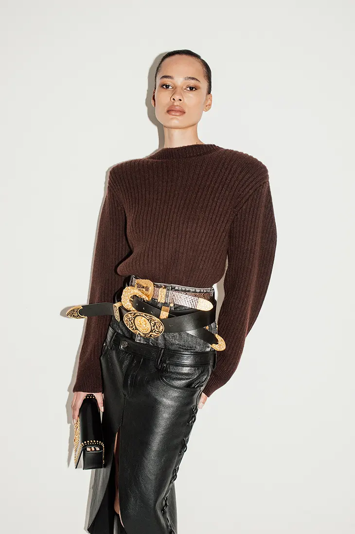 The material introduces a series of dual qualities that guide the silhouettes. It reads as feminine in one moment and masculine in another. Roseberry uses this range to build pieces that shift depending on how the body moves. He pushes leather toward tension, structure, or fluidity based on the cut. Wide-legged cowboy pants show how the material can hold volume without losing clarity. Sculptural belts demonstrate its ability to anchor a look through pressure and precise curves. He works with both supple skins and more rigid treatments, giving the collection a varied surface language.