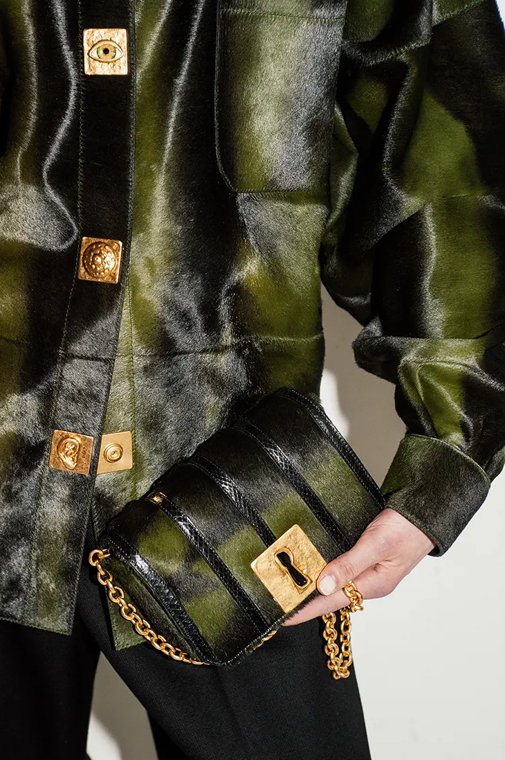 Schiaparelli codes appear throughout the collection. Some pieces carry an exclusive Santa Fe pattern embossed directly into the leather. The motif reinforces the link between Roseberry’s reference points and the house’s signature vocabulary. The pattern sits within the material rather than on top, giving each garment a sense of depth through compressed texture.
