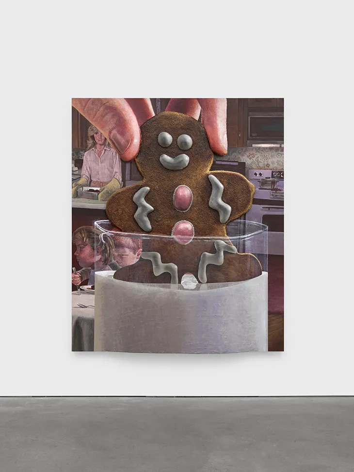 Cold Front extends Abdella’s research into American rituals, with a focus on how joy and festivity often sit beside imitation, longing, and loss. He engages with Robert Gober’s examinations of everyday uncanny detail and Tex Avery’s hyperbolic cartoon logic, using these references to heighten the slippery territory between humor and discomfort. Abdella treats consumer culture as a field shaped by concealment, where bright surfaces carry emotional residue beneath the sheen.