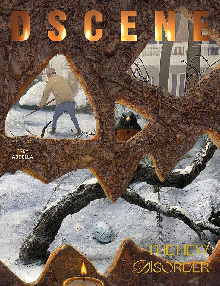 For the first cover of the issue, DSCENE teamed up with Trey Abdella, inviting the New York–based artist to design an exclusive artwork that could hold the tension of the theme rather than explain it. The result is a cover that feels precise yet unsettled, carefully constructed while visibly resisting polish. It does not illustrate The New Disorder so much as operate inside it.