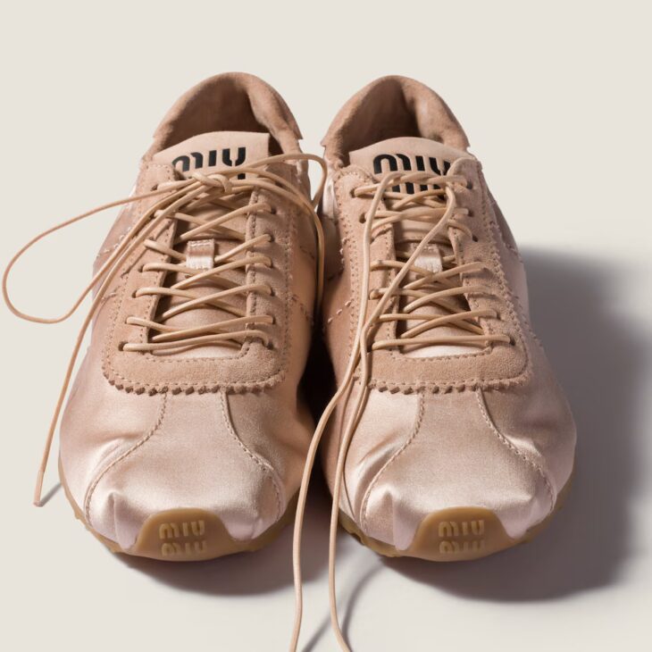 Miu Miu Plume satin sneakers reinterpret the house’s ongoing dialogue with ballet through an ultralight silhouette wrapped in smooth satin. Decorative stitching traces the upper with a delicate precision, while the refined color palette reinforces the shoe’s soft, almost ethereal presence. Lace-up fastening and a fabric lining keep the design grounded in everyday wear, set against a rubber sole finished with a logo and star-patterned tread. Subtle branding appears through a screen-printed logo on the tongue and heel counter, and a removable fabric-covered insole adds comfort without disrupting the sneaker’s clean lines.
