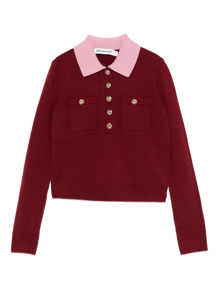 Self-Portrait’s contrast-collar polo top refines a familiar silhouette through considered details and a rich material mix. Rendered in deep dark red, the design features a sharp contrasting collar and a button fastening accented with gold buttons, lending a subtle point of emphasis to the front. Patch pockets and long sleeves give the piece a structured feel, while the wool and cashmere blend keeps it soft and comfortable against the skin. It’s a versatile knit that moves easily between polished daytime wear and more elevated styling, with a finish that feels deliberate and composed.