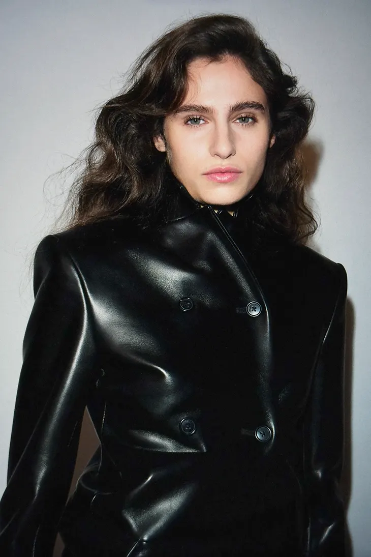 Leather holds a central role, seen in firm jackets with sculpted lines and trousers that frame the leg with structure. One of the most talked-about pieces sits at the other end of the spectrum: an ultra-cropped plongé leather jacket with a stealth-like profile. Specialty hand-done knitted and knotted tulle sets add movement and texture, giving the collection a second, more tactile rhythm.