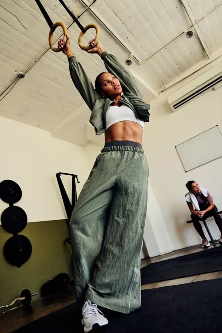 A cropped bomber-style jacket adds a graphic edge, with “Lululemon” printed along the sleeves. The piece brings a direct, logo-forward moment into the lineup while staying aligned with the collection’s muted palette. It pairs with nylon track pants finished with side buttons, a detail that recalls sportswear from the 1990s.