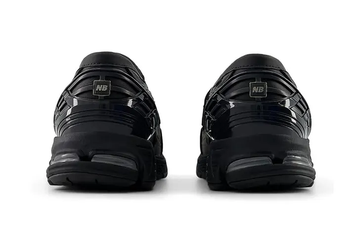 In the “Black/Angora” execution, the shoe adopts a restrained, high-contrast palette that brings focus to its construction. A jet-black mesh base forms the foundation of the upper, echoing the breathable structure associated with the original running model. Glossy synthetic leather overlays sit atop the mesh. These panels give the loafer a defined, assertive profile that stays consistent with the visual identity of the broader 1906 line.