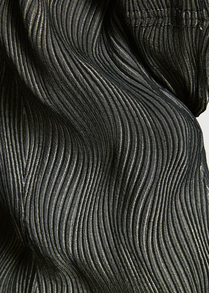 The project introduces two items: a dress and a bolero. Both pieces use Brewed Protein fibers in their natural, undyed state within the weft yarns. By combining these fibers with polyester yarns and activating differences in shrinkage during processing, the garments develop pleated structures through the material itself.