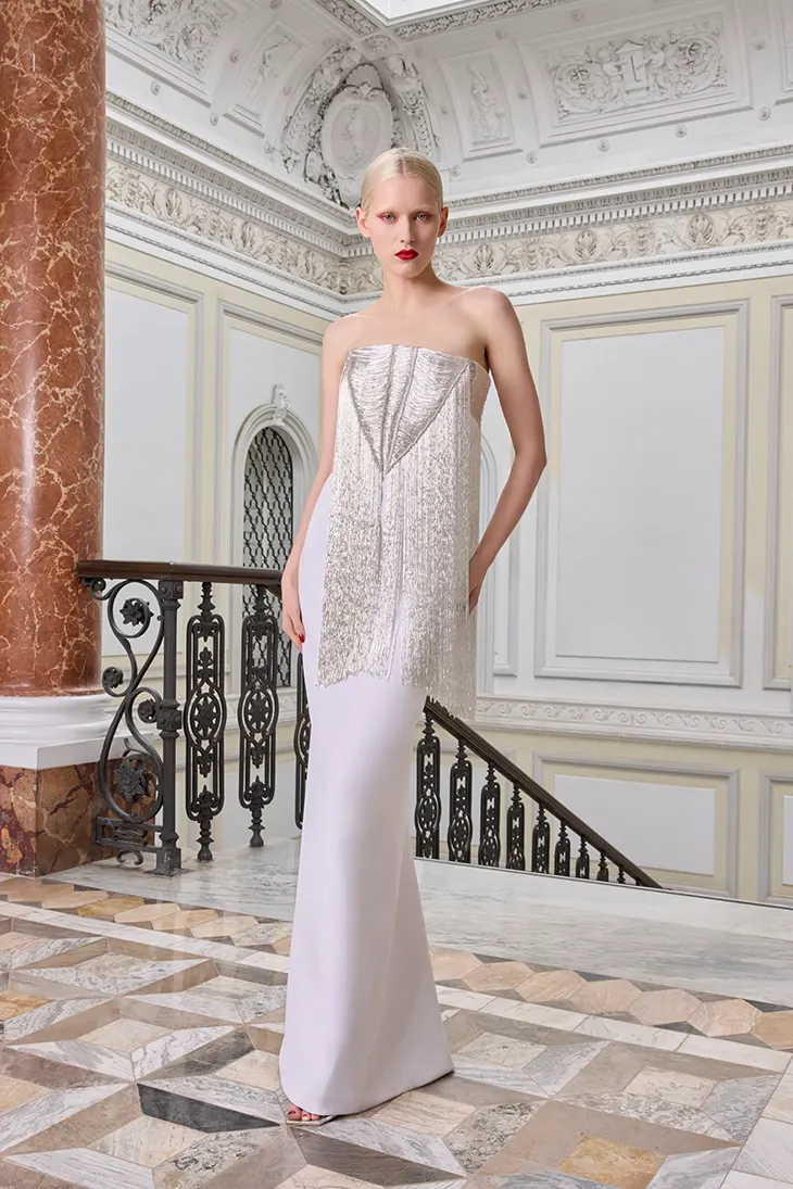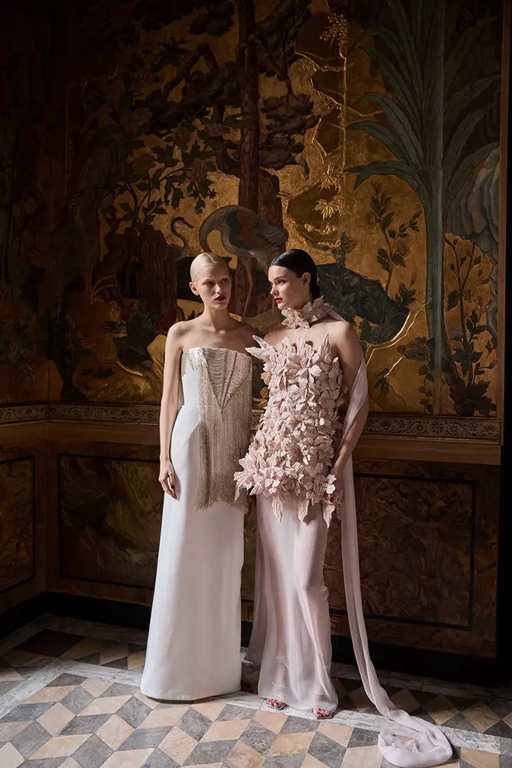Floral embroideries echo carved wooden furnishings found in the salon, translated into three-dimensional forms through raffia and organza leaves. Duchesse satin and crêpe cady establish structure and control, while chiffon and tulle introduce suspension and softness. Cane elements rise from the body to create depth and measured motion. Raffia fringes skim the floor, crystal cascades scatter light, and sculptural flounces open across the silhouette like petals unfolding in sequence.