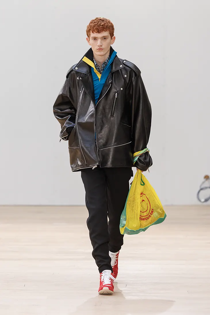 Mid-collection, the layering intensified and the palette darkened. An oversized black leather biker jacket with white piping details swallowed the frame, worn over a bright turquoise hoodie that peeked through at the collar and hem. Beneath that, a checked shirt. Black joggers and red-and-white sneakers grounded the look in street-inflected ease. A yellow mesh tote printed with a smiley face and “Furious Day” text injected irreverent humor into an otherwise tough silhouette. The effect was deliberate accumulation: garments not competing but conversing.