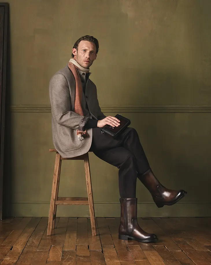 At the heart of this offering lies footwear, and specifically, boots that command attention without demanding it. The Rombo boot in Venezia calfskin emerges as the collection’s defining piece, a design that draws from classic biker aesthetics while maintaining the refined proportions one expects from a house of Berluti’s caliber. The mid-calf height strikes a careful balance, substantial enough to anchor a look without overwhelming it. Goodyear welt construction paired with a non-slip rubber pad speaks to a practical understanding of how men actually live in their shoes, not merely display them.