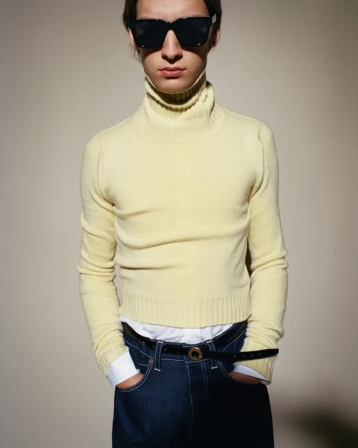 Denim runs through the collection as a democratic thread, connecting tailored formality to lived-in ease. Vintage-wash jeans sit high on the waist, their relaxed leg a counterpoint to structured blazers above. A denim trucker jacket, washed to the perfect shade of mid-blue, layers over a white turtleneck and beneath a black overcoat, the combination reading as effortlessly Parisian while remaining entirely practical.