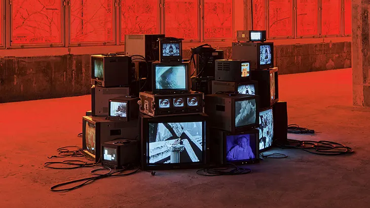 Beyond the garments and footwear, the exhibition reflects on the circulation of images and their quiet influence on collective memory. A 360-degree installation composed of vintage television screens assembles footage from different historical periods.