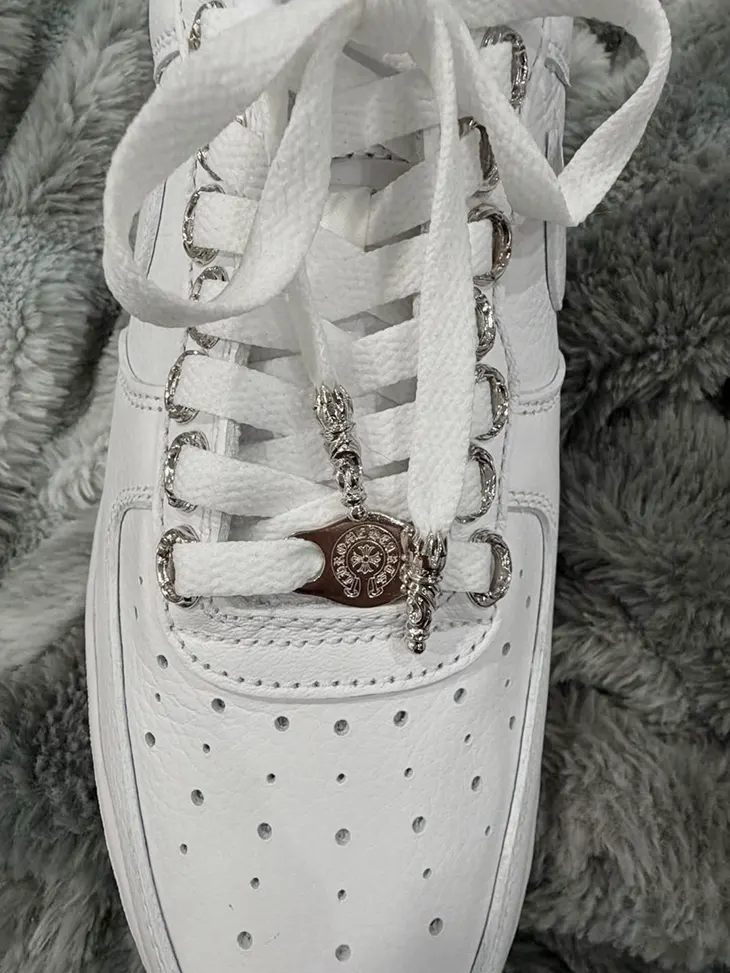 The sneaker appears in a triple white colorway, staying close to the visual language of the original NOCTA “Certified Lover Boy” Air Force 1. Premium leather covers the quarters and toe box, keeping the base clean and uniform. The collaboration focuses on surface treatment and hardware. Chrome Hearts introduces sterling silver elements that replace standard components, immediately changing how the shoe reads without disrupting its proportions.