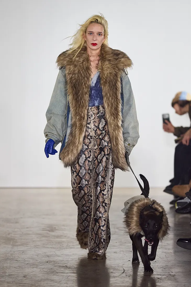 Models walk accompanied by real pets, anchoring abstraction in lived experience. Human and animal move together across the space, forming a shared rhythm that resists hierarchy. Rational structure and instinctive behavior coexist without instruction. The pairing suggests continuity between discipline and impulse, where emotion and control operate side by side.