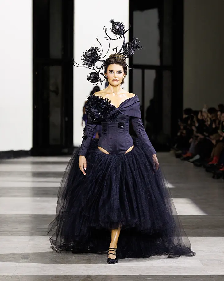 The show opens with Lisa Rinna, whose commanding presence establishes the tone of the collection. Her appearance anchors the work in a living form of couture, where theatrical energy meets disciplined construction. Germanier advances couture as a practice rooted in transformation. The collection frames reuse as a source of invention and positions construction as a site of meaning, where every recomposed element contributes to a renewed vision of form and presence.