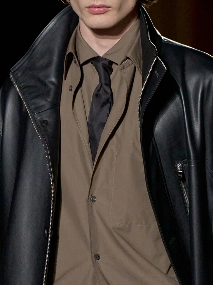 Fifty-nine silhouettes unfolded across the runway, each one a testament to Nichanian’s philosophy that “the line does not exclude comfort but invites it to forge its own way.” The opening look established the tone immediately: a parka in smooth black calfskin paired with a peat compact cotton poplin shirt-blouson, layered over another khaki shirt, finished with impeccably cut cotton-wool gabardine trousers. Pure Nichanian: nothing screaming for attention, everything earning it.