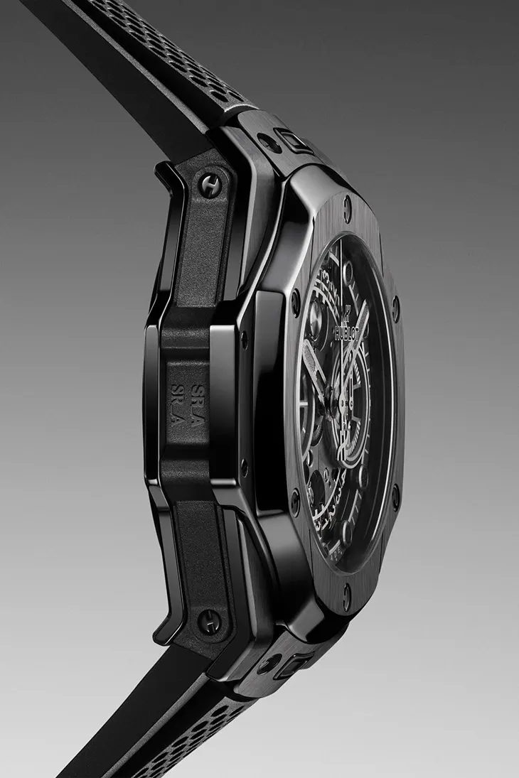 Executed entirely in black ceramic, the 42mm case adopts a monochrome aesthetic that strips the SR_A vocabulary back to its essentials. Satin-finished and polished surfaces create visual tension across the bold geometry and modular construction that defines the Big Bang line. The choice of an all-black ceramic execution carries additional significance: 2026 marks the 20th anniversary of Hublot’s first All Black timepiece.