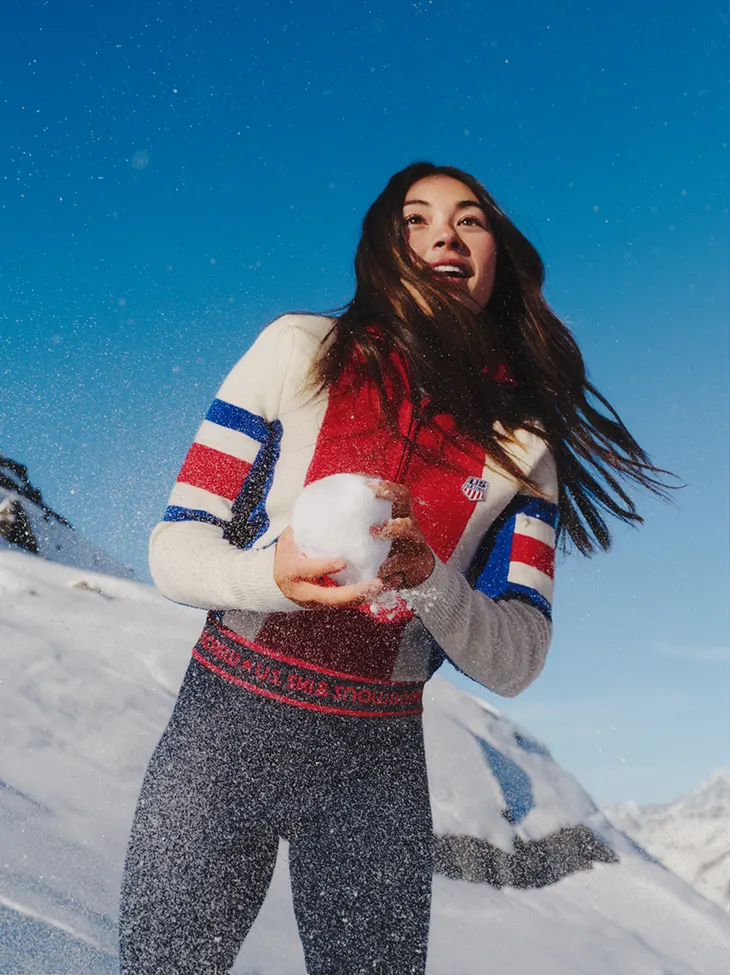 The 26-piece lineup spans knitwear, loungewear, and cold-weather accessories for women, men, and kids, unified by a retro-inflected sensibility and exclusive vintage-inspired patches. Color and fit draw from classic American winter style, updated with a cleaner, more current attitude. The collection expands into performance territory through a dedicated ski capsule developed with Kappa, the official on-mountain partner of U.S. Ski & Snowboard. This capsule introduces technical jackets for women and men, balancing functionality with a refined mountainside aesthetic.