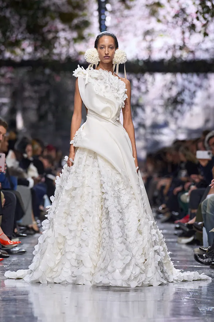 The final bridal look closed the show with restraint rather than spectacle. A twisted bustier gown in gazar, enveloped in layered drapery and embroidered with a gradual bloom of petals, offered a controlled, almost meditative ending. It reinforced the sense that this debut prioritized clarity over theatrical closure.
