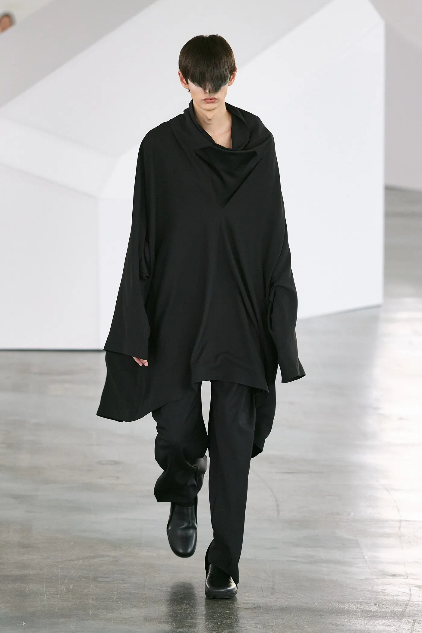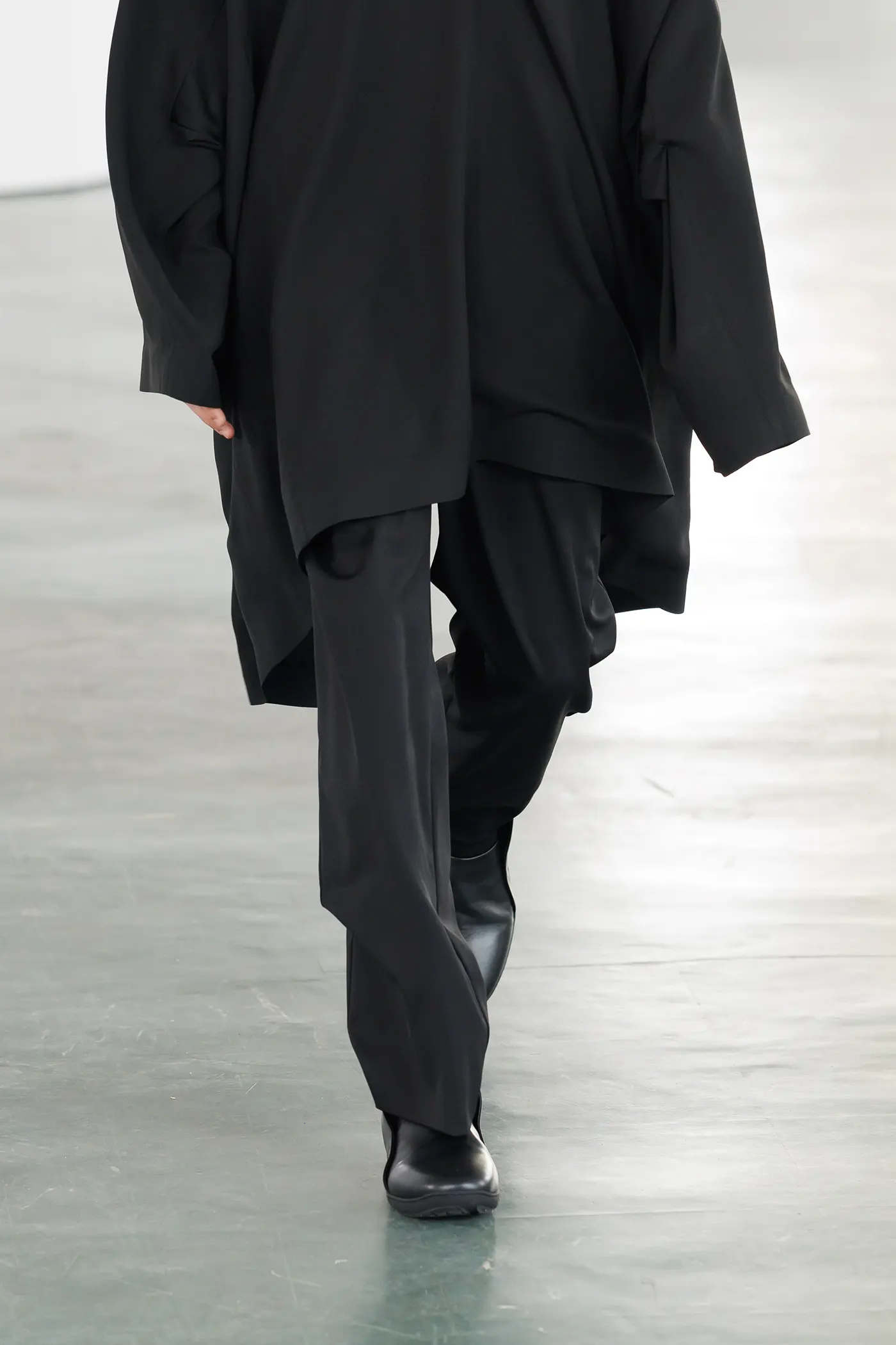 Many garments resist easy categorisation. Blousons arrive with softly curving shoulders, wide necklines, and low-cut arms. Tops occupy territory somewhere between pullovers, shirts, and jerseys. Trousers blur into skirts. Items featuring drapes, wraps, and ties transform on the body, allowing multiple interpretations when worn.
