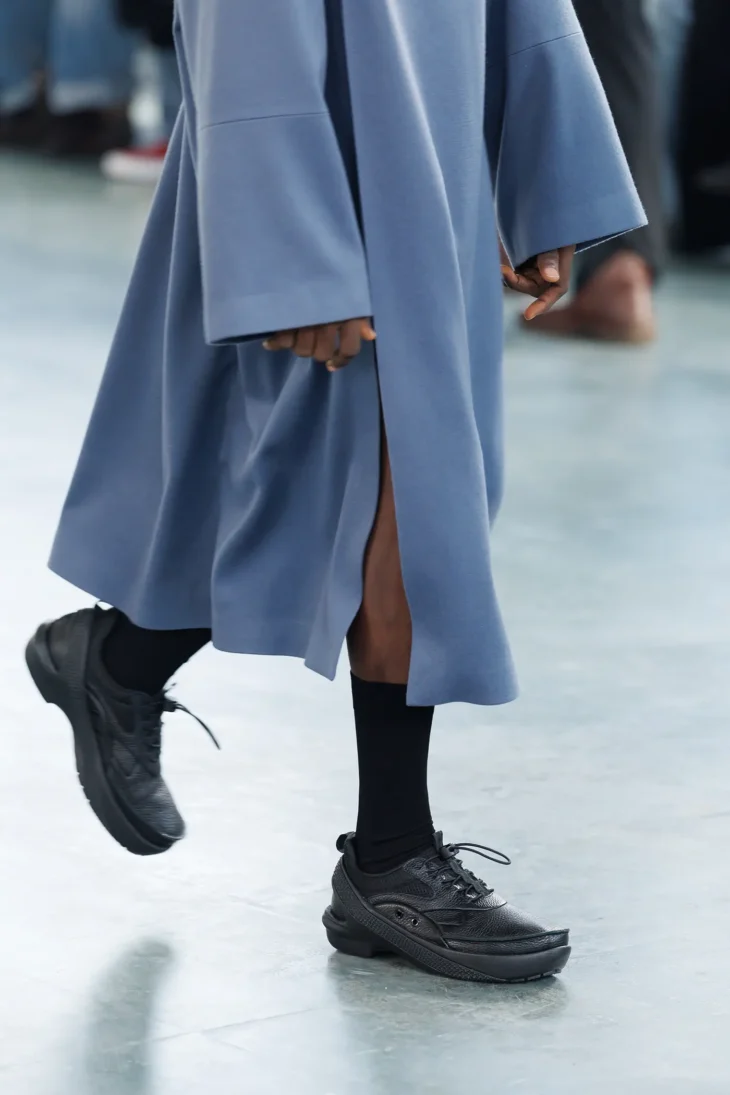 This season also marks the debut of a new collaboration with Crocs, featuring architectural lines and utilitarian directness crafted with minimal topstitching, no eyelets, and the brand’s signature heel tab integrated into the body of the shoe.