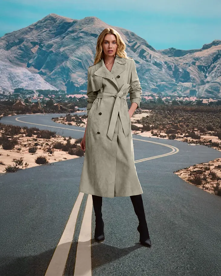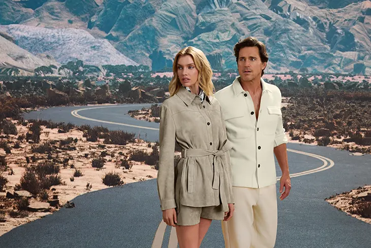 The campaign brings this vision into focus through a narrative shaped by stillness and transition. Shot in Los Angeles, the imagery features returning MACKAGE muse Stella Maxwell alongside award-winning actor Matt Bomer, ahead of the release of his upcoming film Outcome. Together, they appear as two figures suspended within a desert dreamscape, positioned between movement and pause. The rural setting and sun-washed palette mirror the collection’s tonal restraint, allowing the garments to lead the narrative.