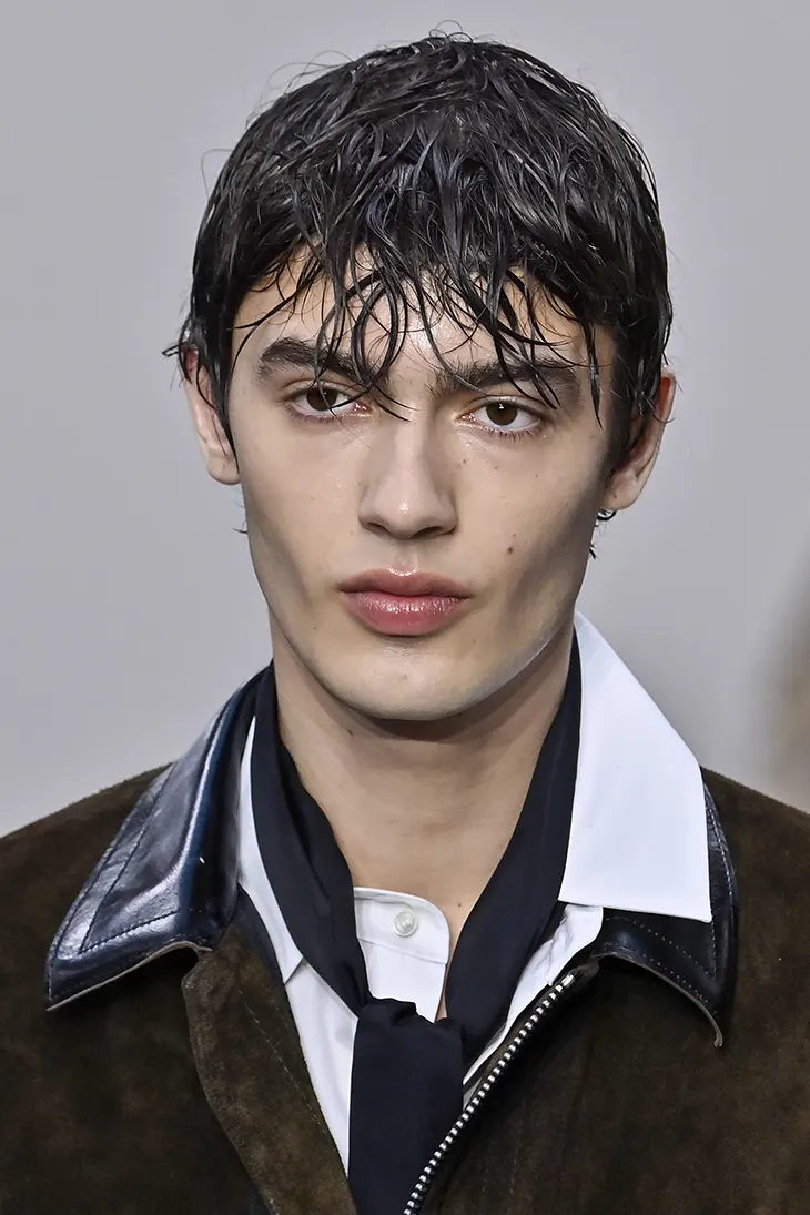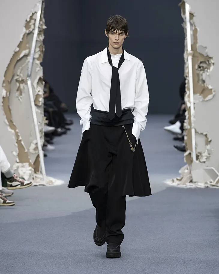 The collection opened with refined subversion. Elegant shirts paired with scarf-like ties wrapped gently around the collar rather than knotted tight. The effect was looseness without sloppiness, formality undone just enough to breathe.