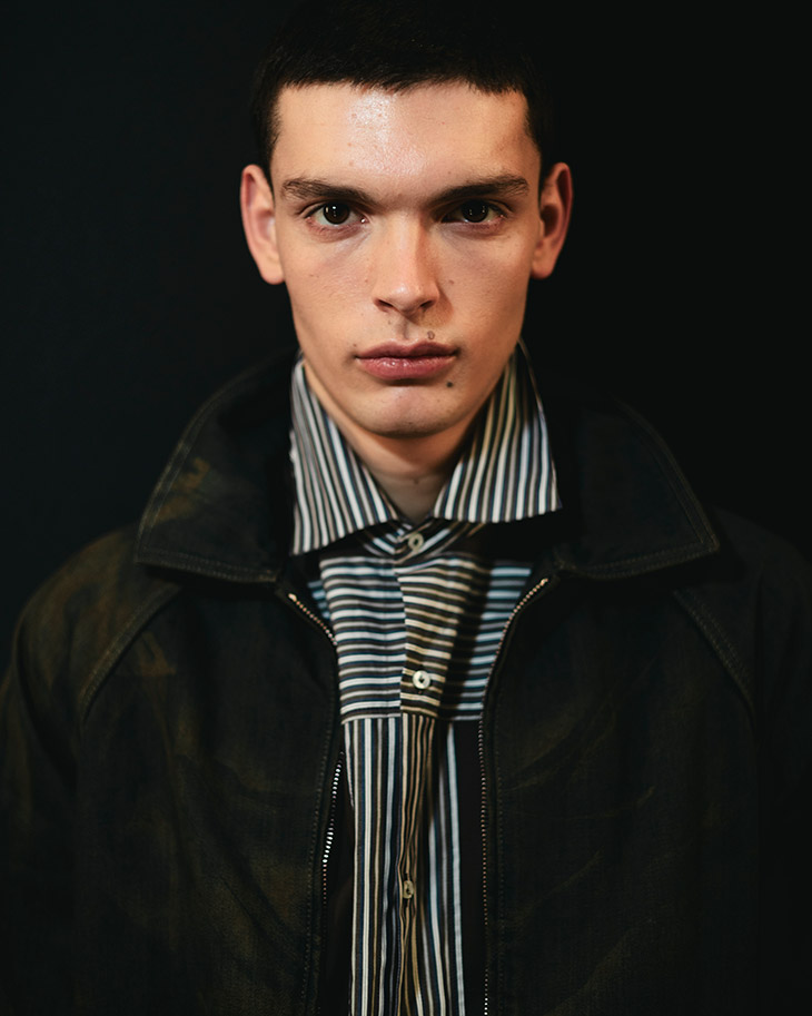 Color choices range through greens, navies, and earthy browns. Textural contrasts pair viscose LENZING™ utility trousers with recycled nylon zip-ups, mohair blazers, and cardigans in alpaca and merino wool. Compression tops printed with hazy body imagery and denim twinsets lasered with sculptural physiques continue the theme of disguise and transformation, closing Masquerade as a study of how clothing enables shifting selves.