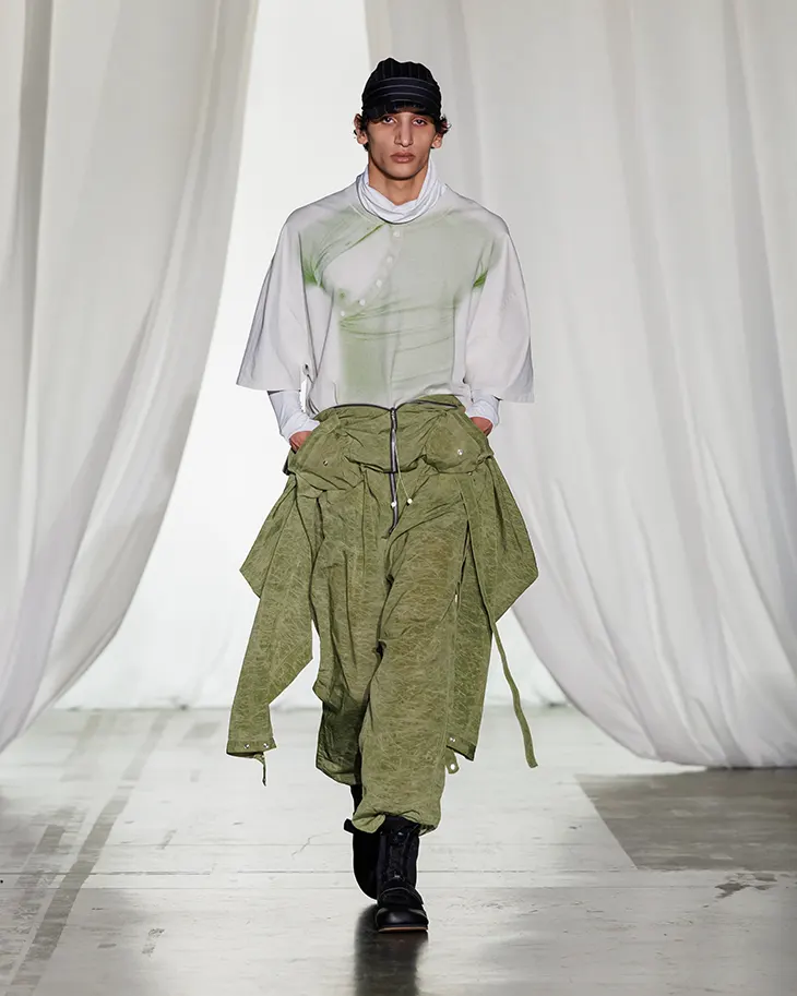 The collection presents a symphony of textures within a palette of greens, navys, and earthy browns. Silky utility trousers cut from Viscose LENZING™ pair with crinkled recycled nylon zip-ups. Furry mohair blazers and nipple-exposing cardigans arrive in alpaca and merino wool blends. The material diversity reinforces the collection’s central thesis: identity is layered, textured, and constantly shifting.