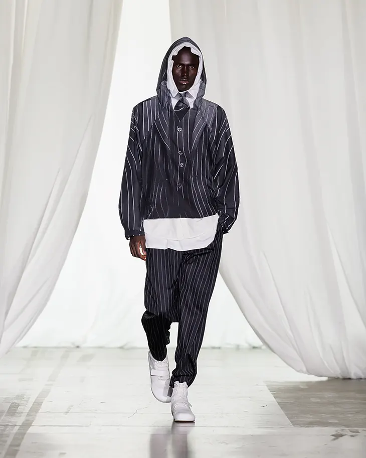 Nash draws extensively from 1980s British and Italian power tailoring, recontextualizing these codes for contemporary wear. Suit jackets arrive with integrated hoods and detachable sleeves, transforming rigid formalwear into modular systems. Shirts feature horizontal and vertical lines inspired by Ben Magid Rabinovitch’s 1931 photograph Tamaris in “Dirge”, crafted from stretch cotton that extends Nash’s kinetic movement philosophy into sophisticated territory.