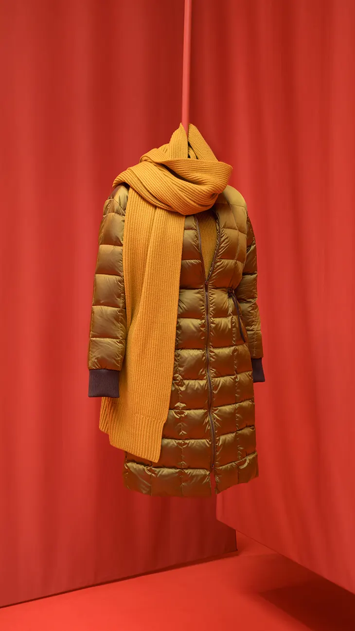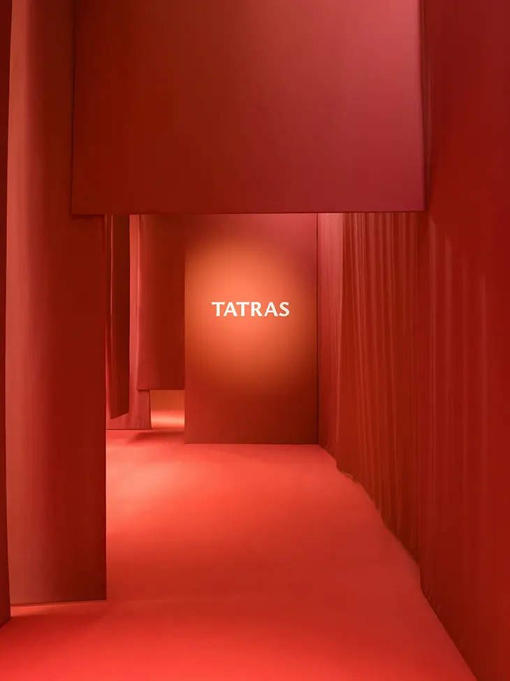 TATRAS introduces Fall Winter 2026 in Paris through an immersive presentation shaped by movement and proximity. The brand selects an industrial setting and softens it with fabric walls that guide visitors through the space. The layout encourages flow and discovery, allowing garments to appear gradually. Pieces hang suspended, giving the impression of floating forms that reveal themselves through motion and shifting perspective.