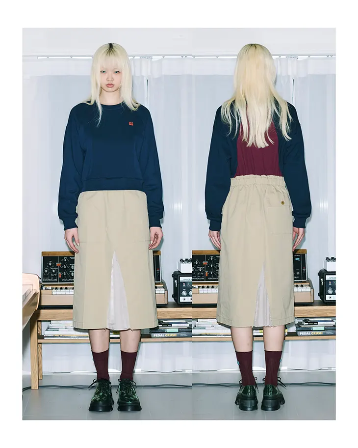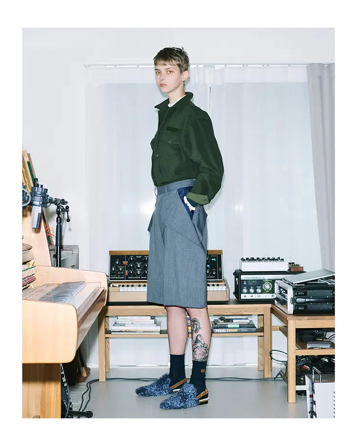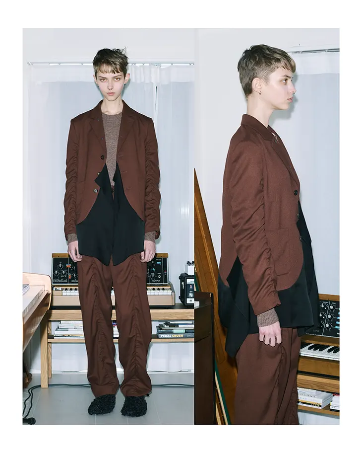 Docking remains central to the collection’s logic. Garments combine contrasting sections through visible joins that shape silhouettes and interrupt expected lines. Jackets extend or split, coats integrate unexpected panels, and layered elements appear engineered rather than added. These structural decisions create dimension without exaggeration, allowing each piece to operate within a practical wardrobe while retaining a strong identity. The technique encourages adaptability, letting garments register differently depending on styling and movement.