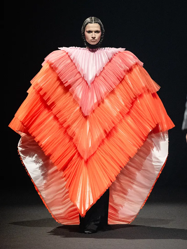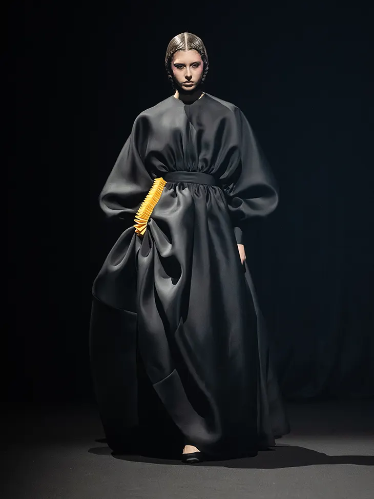 A strong duality runs through the collection. Dense black silhouettes anchor the season, sharp and almost monumental in their severity. These looks establish a graphic foundation, allowing form to read clearly and decisively. Black operates as a deliberate starting point, a color chosen for its ability to define shape without distraction. As the designers note, it remains the most precise tool for silhouette-making. Against this controlled base, eruptions of color appear in airy tulle constructions. These lighter moments feel improvised, like sketches drawn in motion, yet they arrive with intention and balance.