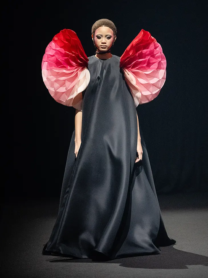 The kite functions as both symbol and system. Its geometry informs silhouettes, while its meaning guides the collection’s emotional register. Each look operates within a precise tension between control and release, where couture construction meets inventive engineering. The garments appear playful at first glance, yet every element reveals rigorous discipline. Theatrical gestures remain grounded in wearability, with volumes calibrated to move, float, and suspend rather than overwhelm.
