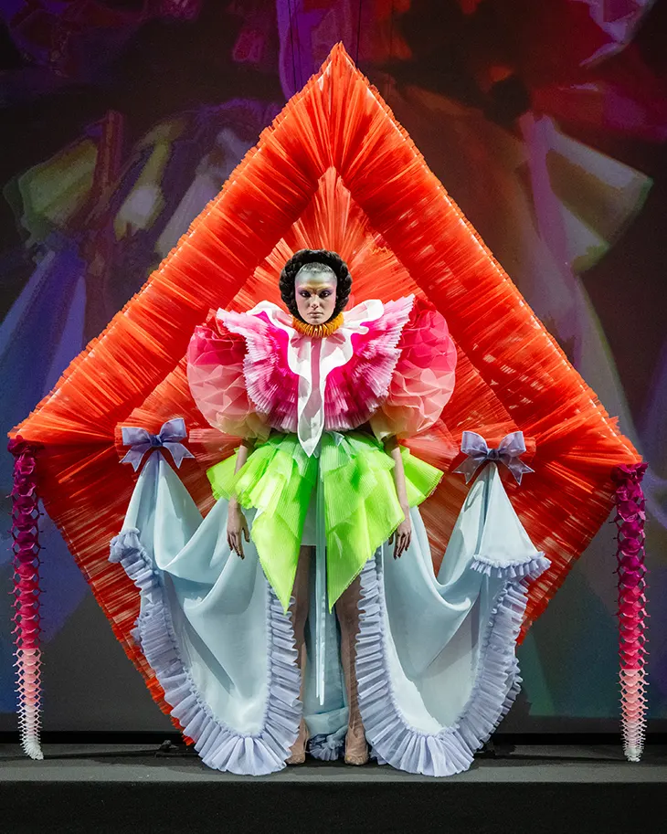 For Spring Summer 2026, Viktor&Rolf present Diamond Kite, a Haute Couture collection that treats freedom as a physical and emotional state shaped by memory, play, and elevation. The season draws its force from a childhood image that refuses to lose relevance: the kite, lifted by invisible currents yet tethered to the ground. Rather than treating the motif as ornament, the designers translate it into structure, movement, and intent.