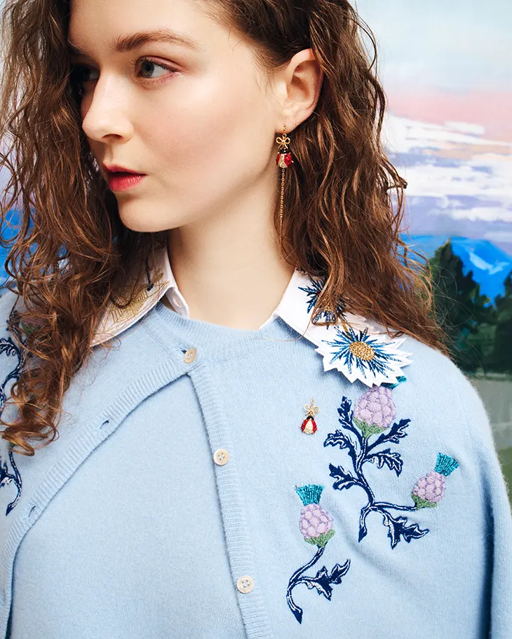 Decoration drives the narrative. Everyday gestures transform into ornament through craft-led execution. Pinecones gathered by hand, woodland flora observed in stillness, and serrated leaves brushed in passing become embroideries, jewel accents, and tactile flocking. Coats, mini dresses, and tailored pieces carry these translations across their surfaces. A legend about fairy water collected among thistle leaves informs a nocturnal universe filled with silent presences and symbolic animals.